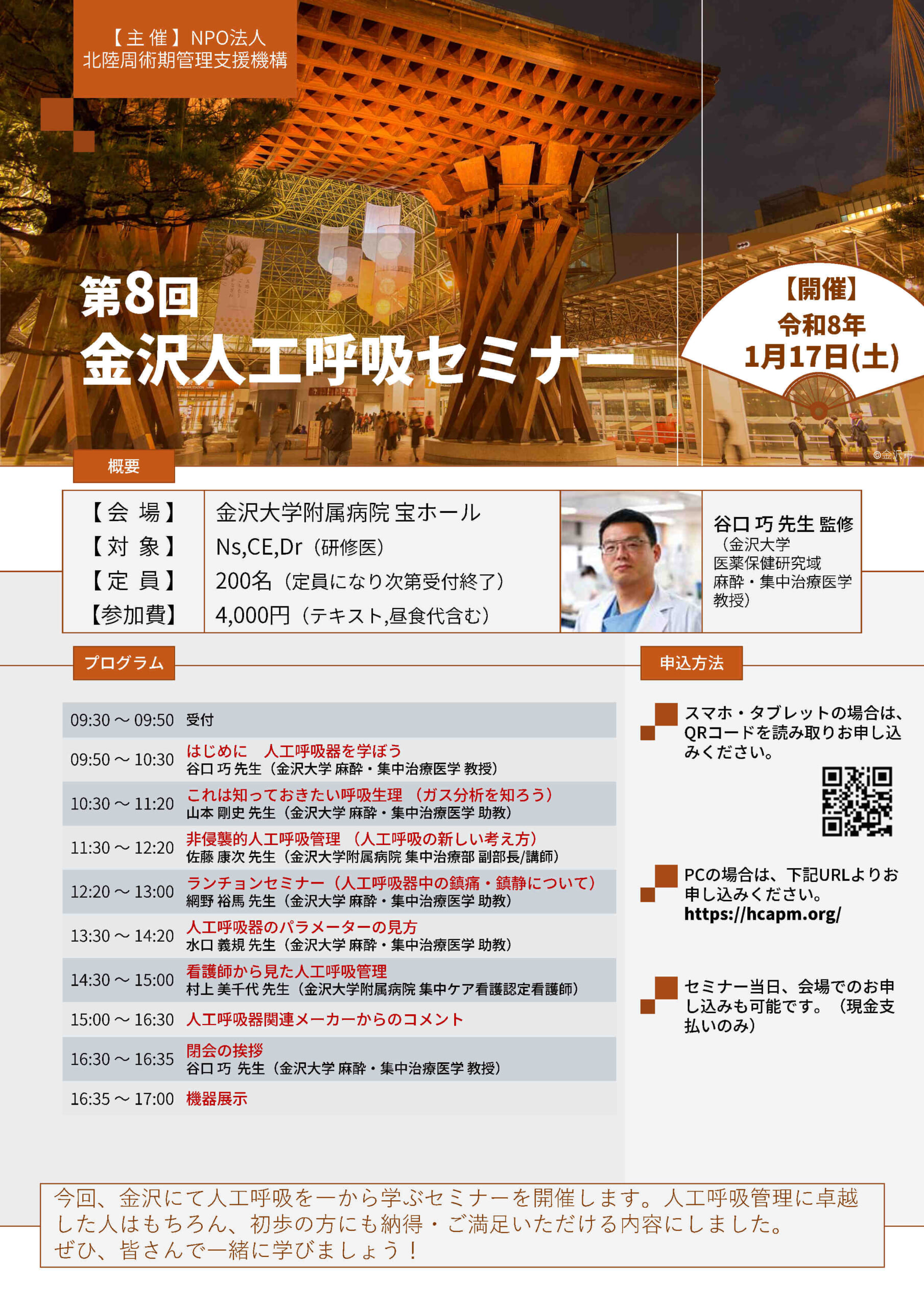 当機構のWebサイトがオープンしましたこの度、当機構の公式Webサイトをオープンしました。今後、こちらのWebサイトを通じて、様々な情報を配信してまいりますので、よろしくお願いいたします。 第8回金沢人工呼吸セミナーのお知らせ第8回金沢人工呼吸セミナーの参加申込を受付中です。ぜひ、ご参加ください。 オンラインセミナーの参加申し込みを受け付けております第5回 金沢循環セミナー<Web視聴コース>の参加申し込みを受付中です。ぜひ、ご参加ください。 当機構について周術期医療に従事する医療従事者の養成・育成を主目的として、様々な活動を展開しております。活動紹介当機構における、これまでの活動実績をご紹介いたします。セミナー看護師、臨床工学技士、研修医の皆様に向けた、セミナーに関するお知らせです。お申し込みも受け付けております。